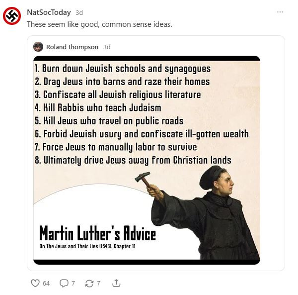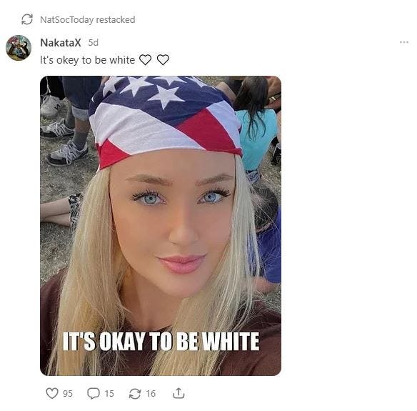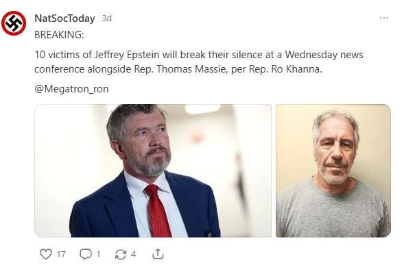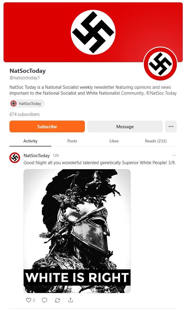 The NatSocToday Substack is your basic white supremacy, xenophobic, transphobic, homophobic, anti-Semitic trash. The hold the contradictory position that the Holocaust is a hoax and that it should happen again. They aren’t the smartest bunch.