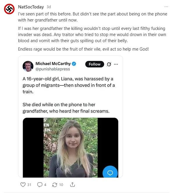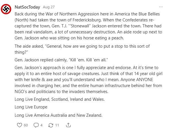Most of the notes and articles that NatSocToday posts are what you would expect but some incite violence which removes all free speech protections and violates Substack’c Content Guidelines.